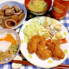 16日、火曜日の晩ごはん♪ ☆ミニ海老フライ(コープさん) ☆マカロニサラダ ☆キャベツとワカメの味噌汁 ☆ネギ納豆ご飯〜温玉のせ〜 ☆残り物の里芋煮 毎日プチ残業、中途半端に忙しい…… コープさんの揚げるだけの冷凍食品は助かる〜(*´艸`*) そろそろ年末年始にむけて、冷凍庫を減らしておかなくちゃ〜(笑) 急に暖かくなるみたいですね、 寒くなったり、暖かくなったり、 体がおかしくなりそうです〜(૭ ᐕ)૭ 今年はあったかクリスマスみたいですよ☆彡