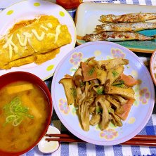 13日、木曜日の晩ごはん♪ ☆じゃが玉ミンチのオムレツ ☆キノコとハムのバター青さ炒め ☆なめこの味噌汁 ☆ししゃもの焼いたん マヨネーズで、遊んではいけません(笑) しかも、オムレツにマヨネーズをかける私ꉂꉂ(๑˃∀˂๑)笑 中身がケチャップ風味だから、マヨは合います♬ なめこに、エリンギに、しめじに、舞茸、昨日は、キノコだらけ〜(*´艸`*)
