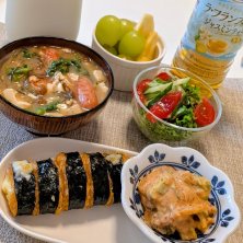 2025.12.17︎🌟早めの夜ご飯︎🌟 ✰チーズキンパ🧀 ✰アボカドキムチ🥑 ✰なめこ豆腐もずくの味噌汁 ✰ミニサラダ🥗(グリーンレタス・胡瓜・トマト🍅) ✰リンゴ🍎・シャインマスカット ✰ᴴᴼᵀほうじ茶(サンファイバー) ⋆┈┈┈┈┈┈┈┈┈┈┈┈┈┈┈⋆ 味噌汁残りにシャウエッセンin‼️うまぁ~😍 見た目の悪い味噌汁だけど~(´▽`;) '`'` このチーズキンパ冷凍のやつで、めっちゃ小さくて(*´艸`)ワラエル でも何気に美味しかった☺️