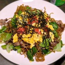 「またまた、醤油焼きそば」 家族のリクエストで我が家の焼きそばを作りました。 毎度おなじみの醤油味の焼きそばです。 今回は麺をパリパリというほど固く焼けました。 でも、少し醤油を入れすぎて辛くなって家族には不評でした。(笑)