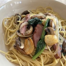 ★ 合鴨パストラミ入り和風パスタ しっかり味付けされてる合鴨 とマッシュルームを入れた パスタ作りました。 炒め物などに使うターサイも 入れてみました。 結構美味しい! ゴロンとしたニンニクトッピング しました。 *ル・クルーゼ