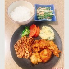 ・鶏胸肉の唐揚げ ・れんこんチップ ・ブロッコリー、トマト、ポテサラ残り ・水菜とゴボウの麺つゆマヨサラダ ・ごはん 昨夜のごはん。ジャーマンポテトの粉が一袋余っていたので、れんこんチップに振りかけました😊 もはやスナック菓子な美味しさでした✨