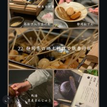【22 静岡県の郷土料理で親孝行飯】#親孝行飯 ・静岡おでん ・喜平特別純米誉富士 ・鮮魚の刺身 ・熱海黒麦まんじゅう 先日社内忘年会で訪れた熱海土産を中心に 両親を招き静岡おでん会を開催いたしました 静岡おでん5箇条は以下のとおり( ´θ`) ①黒はんぺんがある ②濃口醤油と牛すじ出汁の黒いスープにする ③具材は全て串に刺す ④青海苔・出汁粉をかける ⑤辛子をつけていただく 静岡に高齢の両親を連れてやれなくても 皆まるで旅先にいるような盛り上がり様笑笑 全く同じことを 主人の実家でも実施します❕