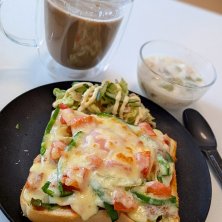 ⋆┈┈┈┈┈┈┈┈┈┈┈┈┈┈┈⋆ 2026.2.22★昼ごパン🍞★ ♥︎ピザトースト🫑🍅🧀🍞 ♥︎キウイバナナヨーグルト(蜂蜜🍯・リンゴ酢🍎) ♥︎𝐇𝐨𝐭カフェオレ(サンファイバーAI) ⋆┈┈┈┈┈┈┈┈┈┈┈┈┈┈┈⋆ やっぱりピザチーズ🧀の方が美味しい◡̈⃝˖*♬ ピーマン🫑のシャキシャキが堪らんねぇー‼️ そういえば昨日食べたクリームうどんの麺、もつ鍋setについてたちゃんぽん麺の様な気がしてきたꉂ🤣𐤔
