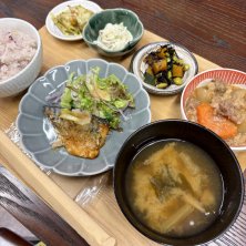 夜になってもお腹が空かないのは、夕方近くにランチを食したから…😓 ☆せいろ蒸し定食 ※せいろ蒸し(←豚バラ肉の塩麹漬け、厚揚げ、白菜、えのき、人参、さつまいも、しめじ、豆苗) ※野菜たっぷり味噌汁 ※小鉢3種 ※十六穀ご飯 今日も飲食部門のサポート要員として駆り出され、朝から厨房業務…💦 今日は予想以上に忙しく、店内が落ち着いてから当店の看板メニューでエナジーチャージ!! このメニューの小鉢は1種なんやけど、調理スタッフが3種にしてくれました👍✨ ありがたや〜🥰💕