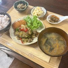 本日のランチ報告〜🤗 ☆めばえランチ ※牛肉とピーマンの炒め物🐮🫑 ※きのこクリームコロッケ🍄🟫 ※副菜3種🥗 ※野菜たっぷり味噌汁🥕🍆🧅 ※十六穀ご飯🍚🥢 今日も朝から飲食部門の厨房サポート。 このペースも何となく慣れてきたかな? お客様の入り具合もまぁまぁで一安心👍 今日の日替りメニューも美味しくいただきました💕