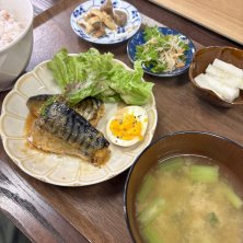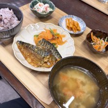 こんな時間にランチ投稿…😅 ☆めばえランチ ※鯖の味噌煮🐟 ※副菜3種 ※野菜たっぷり味噌汁 ※十六穀米🍚🥢 今日も朝から飲食部門のサポート🍳 ランチは社員割引で売上貢献することに。 今日の鯖の味噌煮、マジ旨で大満足でした〜👍✨