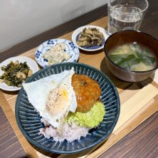 夜ですがランチ投稿いきまーす🤗 今日も職場のカフェにて… ☆めばえ定食 ※ロコモコ丼 ※副菜3種 ※野菜たっぷり味噌汁 ようやくアレルギー性鼻炎も落ち着き、声も出るようになりました〜👍✨ 復活した途端、今日のランチ営業はめっちゃ忙しかった…😅💦 休憩時間に社員割引で日替りランチを注文したら… う、旨ーーーーっっ!!!😆💕😆💕 これ、当店のレギュラーメニューにしたいわ🌱