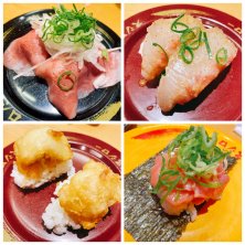 スシローで夕食🍣 オット👨から、初日の夜はスシローだから🧓とのことだった😅オットが3月に1人で帰省した時もそうだった。義母は、夕飯作りが面倒になってきてるのだろう。。 左上: 和牛さしとろポン酢ジュレ 右上: 漬け胡麻活〆真鯛 右下: 大トロ包み(正式名称?)* 左下: 鱧の天ぷら寿司(正式名称?)* *検索しても何故かメニューに出てこない😅 鱧の天ぷら寿司美味しかったのだけど、後から回ってる寿司見て私が美味しそう!と言ったらオット👨さっき食べた鱧のだよ、と言うから、上に乗って