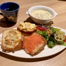 きのこスープ バケット(明太子、玉子、) サラダ、キウイ バケット好きな私❤️美味しかったー