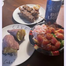 ドンドンドンキーで買って来たのでお夕飯 ポケ丼 ドンキーと言えば焼き芋 和牛串 ポケ丼は、ベストセラーらしく,美味しい❤️ 和牛串は、ソースがめちゃくちゃ好み。 好き❤️❤️😊
