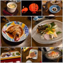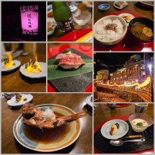 食前酢 葡萄 前 菜 日替り五種 刺 身 旬の魚介類 強 肴 伊勢海老のお造り 一 品 和牛の握り寿司 御神火 さざえの壷焼き 郷土料理 金目鯛の姿煮 陶 板 熱川ポーク陶板焼き 蒸し物 茶碗蒸し 食 事 オリジナル梅ちりめん御飯 赤だし味噌汁 山形 尾花沢産のお新香 水菓子 杏仁豆腐 葡萄 林檎 日本酒 下田黎明 静岡 2025/08/13 夕食