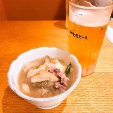 幼なじみと初めて行く居酒屋で乾杯。お通しは芋煮。