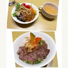ステーキ丼 1850円 サラダとスープは食べ放題 ライス少なめは100円引き?だったかな? 米高いから大盛りで料金アップは当たり前だけど少なめで値引きは初めて‼️ 良心的で好感度🆙 ステーキも柔らかくて美味しかった😊