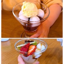 おやつ 土井のしば漬け本舗でお漬物買って、ついでに“しそバニラソフト食べてみたい”けど“おやつは別に食べたい”と言うので、ちびーずに味見させながらほぼ私がいただくことに。笑 で、“ココスがいい”と言う…せめてガストとかさとなら帰り道にあるのに…とか大人は思いつつ、下がってココス。 1号ちゃんは季節限定のいちごのあんみつ、2号ちゃんはプリンには目もくれず白玉あずき。好みの系統が変わってきたか?1号ちゃんは夫さんが注文したポテトもパクパク食べてました。