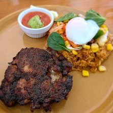 平日ランチ限定のポロネーゼ&ハンバーグ 半熟卵の上に刺さった旗がお子様ランチみたいで可愛いなぁ🥰 なんて思ってたら、ハンバーグから落ちない様に、一番下まで貫通してました(笑)