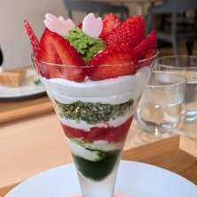 花ひらく桜パフェ グルテンフリー 卵.乳製品不使用 いちごが花びらのように咲き誇る 春の抹茶パフェ 自家製抹茶ソースのほろ苦さが重なり、甘酸っぱさと優しく調和