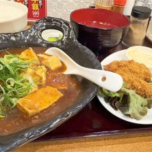 麻婆豆腐とカキフライで昼飯