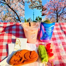 今日のおやつ❤ 隅田公園でお花見🌸🍡 米粉うし焼き(カスタード)🐮 苺みるく団子🍓🍡 ずんだ団子🫛🍡 和紅茶の苺ミルクティー🍓