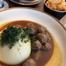 ゴロゴロミートボール。神々しいマッシュポテト…食いきらん…しかしこれと同量のライス+カレーだったらタブンぺろりと食べてしまうのではないかしら?ちょっと不思議ね。