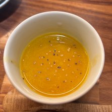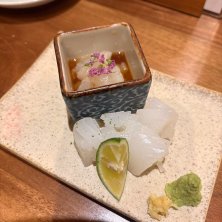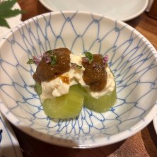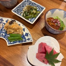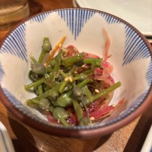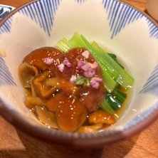 手前は赤城しぐれ(蕪)の甘酢漬け、鳥海ナメコと小松菜、ミズコブと紅芯大根、冬子出汁で炊いたおから