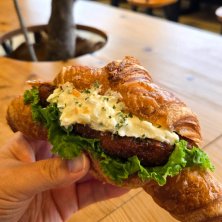 クロワッサンの白身フライサンド🥐 外サク中モチのクロワッサンで、身がフワフワの白身フライ🐟 ここのパン、好き🍞 特に塩パン。←もちろんお持ち帰り♪