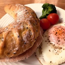 贅沢なひとり飯 ドンクのカマンベールホーンに生ハム挟んで目玉焼き添えて 贅沢過ぎるやろ😋