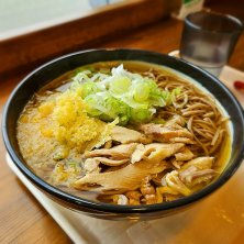 寮の駐車場泊後の朝ごはんは「肉そば 温かいの大盛で」670円!お腹いっぱいです。あたたまりました。