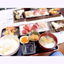 おまかせ定食 1,200円 お刺身3種(マグロ、鰤、スズキ) 天ぷら2種(キス、蛸と玉葱のかき揚げ) ごはん、あら汁、小鉢、漬物 おまけの焼き魚はスズキのカマ焼き これでこのお値段!!