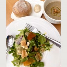 全て自然農法の食材のメニュー 季節野菜のグレインズサラダ 菊芋ポタージュ 自家製湯だねパン豆腐のチーズ添え これはほんとに美味しかった。