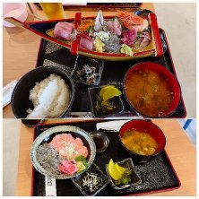 今日は旦那と湘南茅ヶ崎道の駅へ🚙 7月にオープンし、凄く混んでるというので、そろそろどうかなと😊 平日でもやはりたくさんの人が😅 家から海沿いを通り,1時間ちょっとですが、早めに行ったので駐車場もまだまだ空いてました。 ゆうまん丸食堂は11時からで舟盛り定食と生シラスとネギトロ丼を😄 今日から茅ヶ崎市、キャッシュレスのキャンペーンをやってて、d払いで20%還元でお得に食べれました🥰