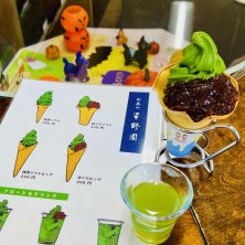 汗ばむ秋にひと息🍂 長袖を少しめくって 濃厚な抹茶ソフトを 小倉餡で頂きました😋