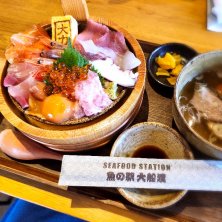 海鮮丼あら汁付き🐟 前回行ったときは、行列で食べられなかった海鮮丼。 生卵かとおもいきや、絶妙な柔らかさでした🥚