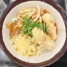 2025.10.13(月) 朝メシ カレーうどん,鶏天@おにやんま おにやんまエキュート上野店初来訪。 月替りのカレーうどんだけだと物足りないかなーと思って鶏天を追加したら、まさかのカレーうどんには最初から鶏天×2が乗ってるとはww