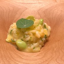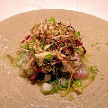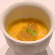 パターナッツの冷製スープ、耕期貝、トマトジュレ