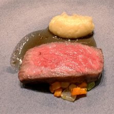 大分県産米仕上げ牛のポワレ、 じゃがいもとニンニク