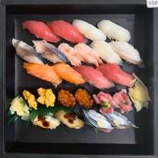 こんばんは! 久しぶりに実家に泊まりに来てます デリバリー専門店で特上を注文してくれました🍣 母がシャリ少なめで注文(右上のシール) 回収不要の紙桶がシャレてました😄 美味しかったです❗️