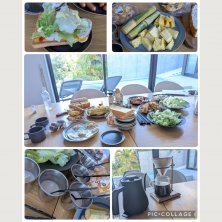 あまり物で朝食 ここは調理器具が充実してる バルミューダの調理家電で統一してるし 土鍋やセイロまで有る。