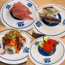 台湾高雄市の大型な旗艦店で初めてのくら寿司体験 素材だけのシンプルメニューが多く40NT$/皿(約200円)変わり種は少なかったが写真右下のスパイダーロールとタブレットの日本名物が表示されていた巻き寿司。揚げたソフトシェルクラブにスパイシーなソースのかかっている。こちらは80NT$(約400円)