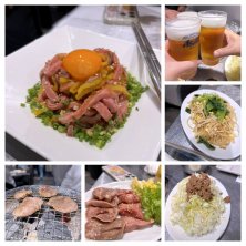 またまた不動産屋さんと飲み会🍻 1人遅れてきたのでまずは3人で乾杯🍻 もやしナムル 千切りキャベツそぼろのせ 韓国のりで包んで 豚タン 牛タン ロース カルビ 牛肉のユッケ ハツ のど軟骨など コースでお願いしていて、飲み放題です😋