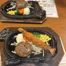 夜の外飯 ハンバーグと有頭大エビフライ ガーリックライス つなぎの少ない肉の旨みたっぷりのハンバーグ さわやか似😋