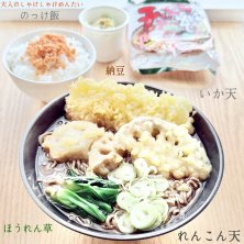 休日の朝ごはん🍚 ナリタヤの天ぷら乗せたそば😋 大人のしゃけしゃけめんたい…のっけ飯😋