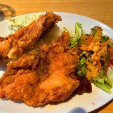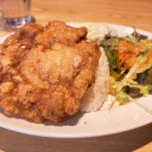 恒例の月一こどもカフェ。大人は300円。ジャンボ酒粕熟成唐揚げプレート。