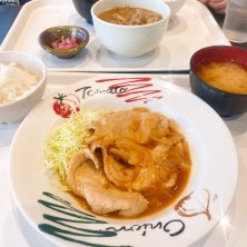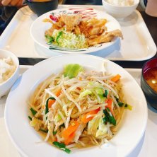 月曜日のお昼ごはん🕛 オットと一緒に。 👩肉野菜炒め 👨生姜焼き ここの味噌ラーメン🍜美味しかったから(オットが前に食べたのを味見)迷ったけど、昨日はオットが生姜焼きにすると言ったので、少しトレードできる様に選んだ。 油っぽく無くて食べ易かった。お酢が無くて残念。簡単酢あったから少しかけてみたけど、あんまり味変にはならなかった。 食堂だけど漬物付いて無くて残念。。
