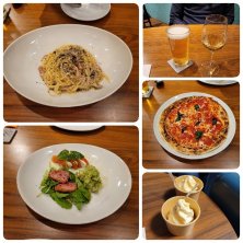 夕飯はイタリアン。メニューがHPと違って少なくて、あまり食べたいものがなくて残念。 右下はホテルの無料サービスのソフトクリーム。