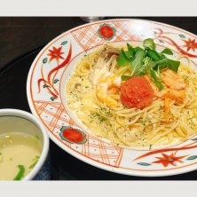 何気に初?記憶ないだけ?ってテイの五右衛門🍝 洋食で、箸「も」あれば楽なこともあるが、箸「だけ」では食べ辛い物もあるよね? レンゲ?匙?はついてるが、フォークなしでスパゲッティは、かなり食べづらいと思うのは私だけ?💦 加えて、都心のビジネス街と違って、草加のランチタイムは高齢者多め。豪快にすするおじいちゃん等が居て、スパゲッティ屋なのに蕎麦屋かラーメン屋のような音がする🤣🤣 スパゲッティは熱々で美味しかった👍 秋限定 海老ときのことサーモンの明太クリームソース