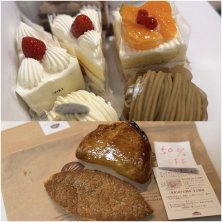 シャトレーゼで買ったお土産ケーキたちと 朝ごはんのアップルパイ🍎 アップルパイの表面に切れ目を入れ忘れて焼いてしまったそう。それでよければ半額で販売してます‥ と小声で仰るお姉さん。そんなことあるんだ〜☺️ せっかくだからそれいただいた🍎
