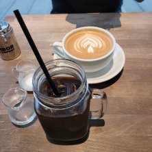 児島ジーンズ👖ストリートに来てみました。先ずはコーヒー休憩。カフェラテとオーガニックアイスコーヒー、美味しい🥰