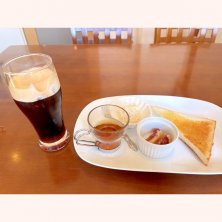 アイスコーヒー Aモーニング付き 表面の泡もコーヒーで作ってあるので ストロー無しで飲んで下さいとのこと。 まるでビールのように飲んだ🍺 温かいほうじ茶が何気に口直しできて嬉しい。