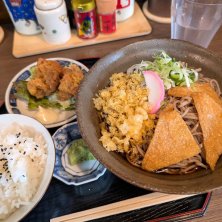 お一人様ランチ 気になっていた蕎麦屋 冷やしたぬき蕎麦平日ランチ1000円 唐揚げ ライス付き 車の運転は 暑くて 冷たいおそば頂きました〜 美味しかったです😊